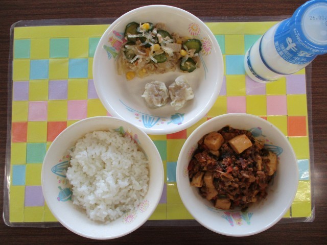 今日の献立は、ごはん、牛乳、マーボー豆腐、ポークシューマイ2個、バンサンスーでした。