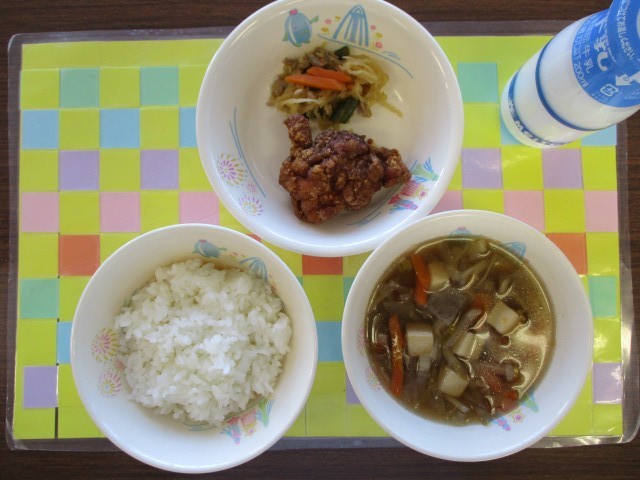 今日の献立は、ごはん、牛乳、とり肉の竜田揚げ、切干しだいこんのいため煮、けんちん汁でした。