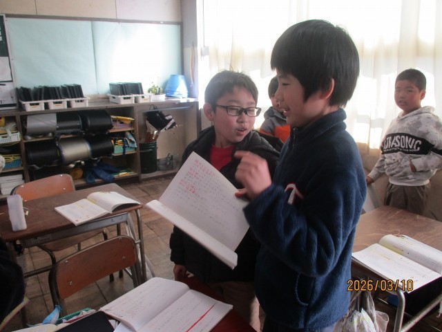 モチモチの木は最終回です。主人公の豆太は、お話の最初と最後で変わったかどうか話し合いました。