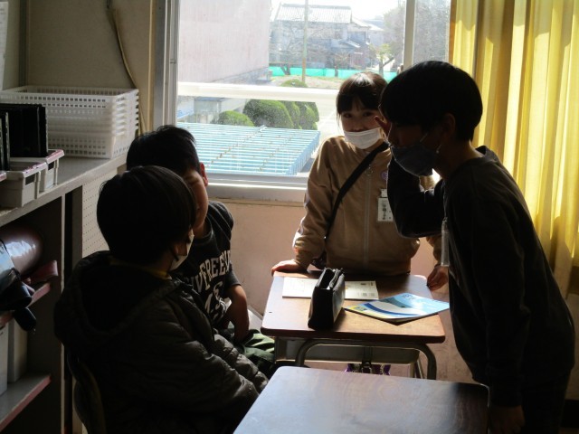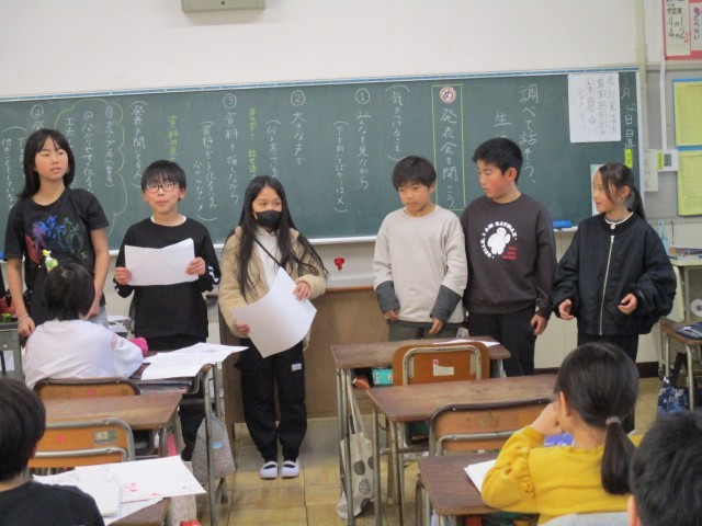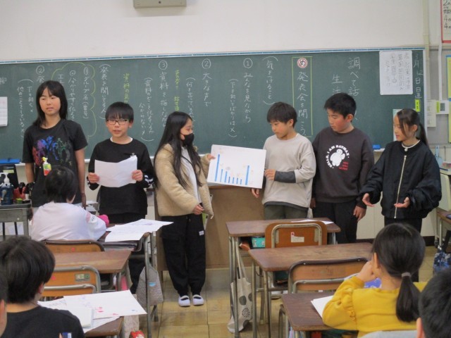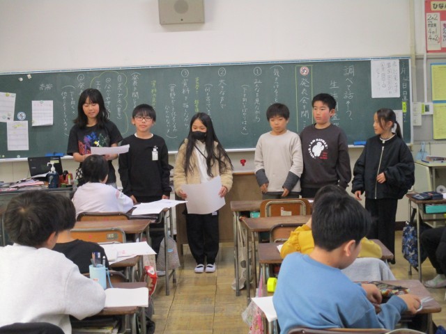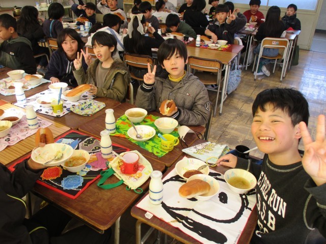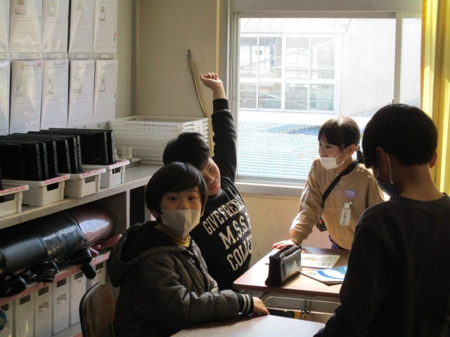 交流学級での様子です。みんなと給食をを食べたり、休み時間に話したり、発表したりしています。