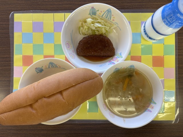 今日の献立は、サンドイッチロールパン、牛乳、ハムカツサンドの具(ソースハムカツ、キャベツのドレッシング和え)、コンソメスープでした。