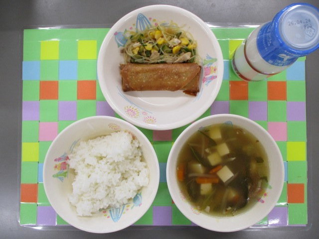 今日の献立は、ごはん、牛乳、春巻、バンサンスー、チンゲンサイと豆腐の中華スープでした。