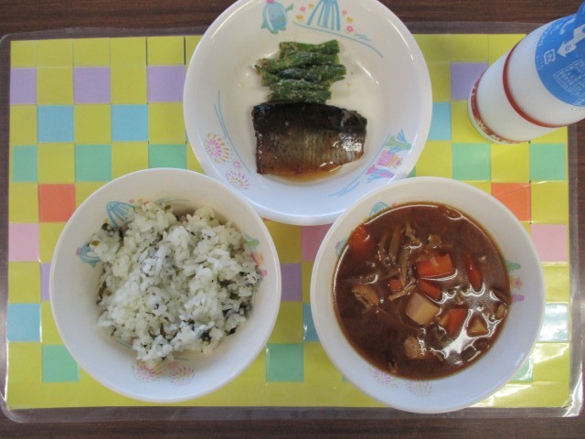 今日の献立は、わかめごはん、牛乳、にしんの甘露煮、いんげんのごま和え、ぶた汁でした。