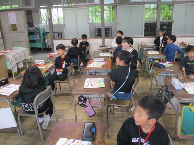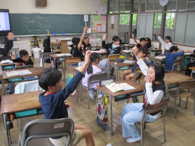 3年生からは、毎週英語の授業があります。今日は英語のあいさつや自己紹介を練習しました。相手を変えて何度も何度もあいさつするうち、自然と声が大きくなり、みんな笑顔になりました。