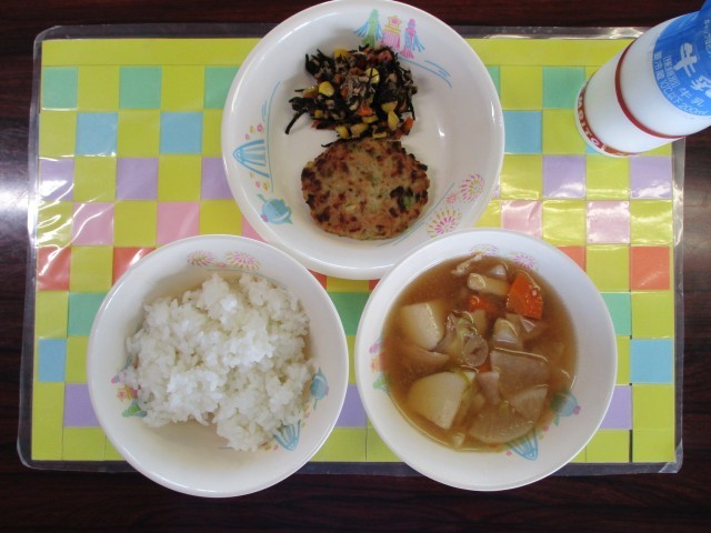 今日の献立は、ごはん、牛乳、キャベツ入りつくね、ひじきのいため煮、のっぺい汁でした。