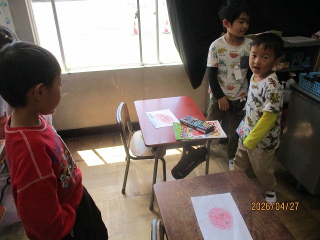 「あさのおひさま」の詩を聞いて、絵を描きました。いろいろなおひさまがありました。背景も想像して、上手に描きました。