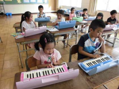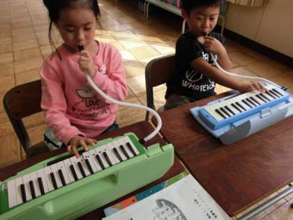 音楽の時間に、鍵盤ハーモニカの音を出してみました。「左の方が音が低いね。」「長〜く吹いて音が伸ばせるよ。」いろんな発見をしました。「聞いてください。ぼくは車のクラクションの音を見つけました。」「わたしは、救急車の音を見つけました。」「ぼくは、小鳥の声が出ます。」いとんな音も見つけて発表しました。
