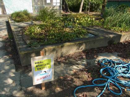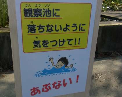 「観察池に落ちないように気を付けて」の看板を設置しました。観察池は、深いものではありませんが、念のため看板を設置しました。