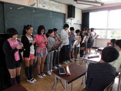 今日は2組で、リコーダーの演奏会をしました。