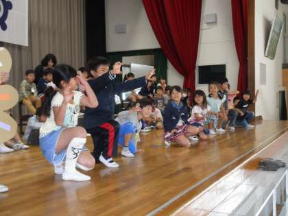 学習発表会の練習を体育館で始めました。大きな声でセリフを言ったり、セリフに動きを付けて動いたり、一生懸命頑張っています。