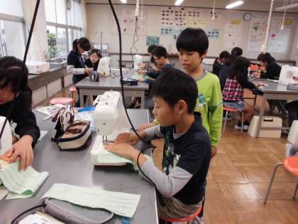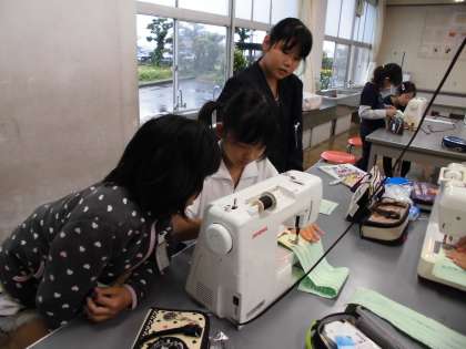 家庭科の授業で、ミシンの練習をしています。上糸や下糸のセットの仕方を確認しながら練習していました。