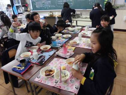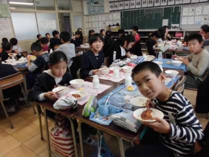「いただきます」の後、みんなで仲良く給食を食べました。