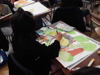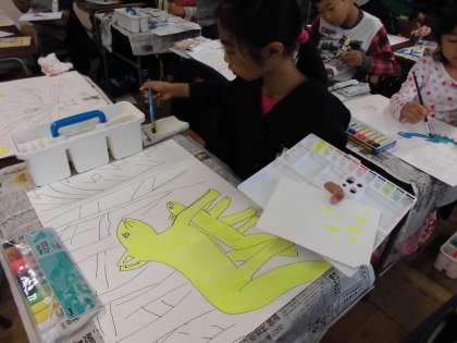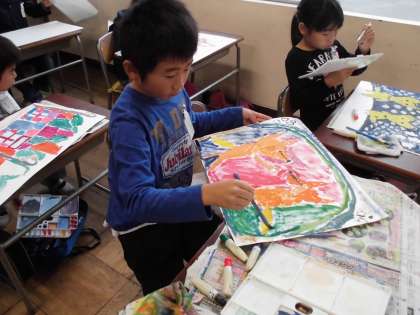 図工で、自分が本を読んで気に入った場面を描いています。描きたいものを大きく描くことを意識して描いています。完成まであと少しです。みんな黙々と取り組んでいます。3年生の素晴らしい姿です。