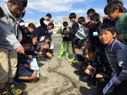 子どもたちは、流れる水が地面などを削る「しん食」、削ったものを押し流す「運ぱん」、積もらせる「たい積」といった働きを確認し、目をキラキラ輝かせながら楽しく実験に取り組んでいました。