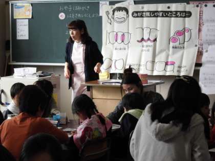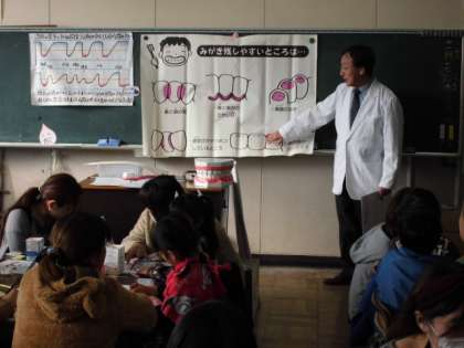 1年生の子や保護者の方は、歯磨き指導にみえた学校歯科医の先生や歯科衛生士の方から、磨き方のこつや歯を守るために大切なことを聞きました。