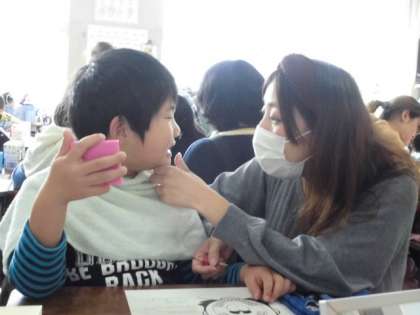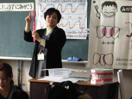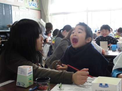 染め出しでは、真っ赤になった口の中を鏡で除きこんだり、保護者の方に見せる場面もありました。