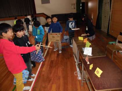 今日はおもちゃ祭りです。どの子も張り切ってお店屋さんになり切って優しく1年生の子達のお世話ができました。「お客さんがいっぱい来てくれて、景品がなくなっちゃった!」「列がいっぱいできて大変!」などと嬉しい悲鳴を上げていました。1年生も2年生も笑顔いっぱいに触れ合うことができました。