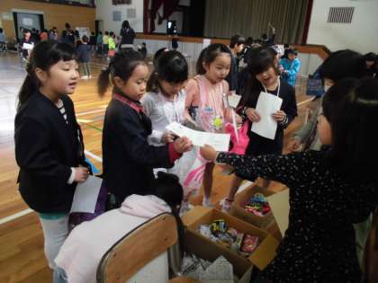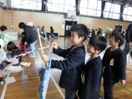 2年生に招待状をもらってから、ずっと楽しみにしていたおもちゃまつりです。屋内運動場にたくさんのお店が出ていて、どの店に行こうかなとわくわく。2年生が上手に遊び方を教えてくれたので、楽しくたくさん遊べました。景品をもらってにこにこです。