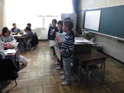 今日は、国語で短歌の勉強をしました。グループでお気に入りの一首を選んで、前で発表しました。