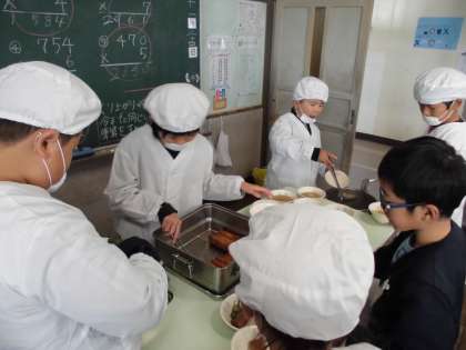 今日の給食の様子です。毎日、子どもたちは協力しながら給食の準備をしています。今日の給食は、ラーメンでした。美味しいと食べている姿が印象的でした。