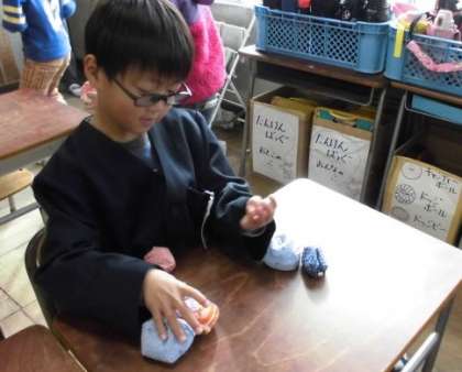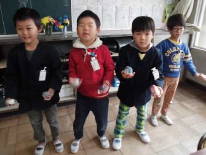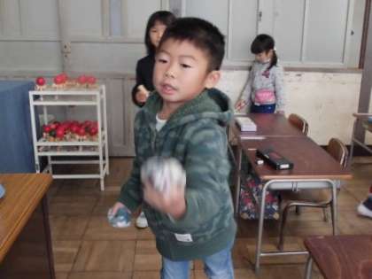 今日は、けん玉とお手玉をしました。お手玉を二つ投げて受けられる子、五つ玉で遊ぶ子、三つ投げて受けるのに挑戦する子、みんな楽しくがんばっています。