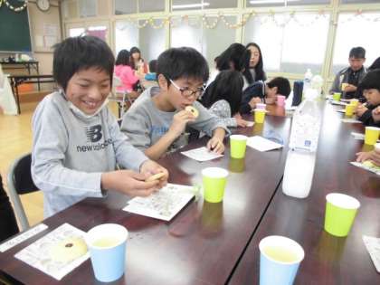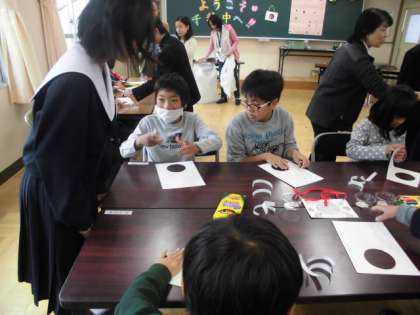 中学校の生徒と写真入れを作ったり茶話会で懇談したりしました。