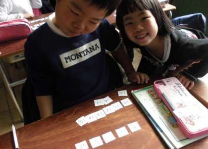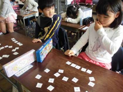 算数の時間に、数字と、+、−、=の記号を使って式を作り、一枚を裏向きにして当てるゲームをしました。「たし算なのに、ひき算をするとわかるよ!」「順番に数えたらわかったよ。」ゲームをしながら、計算が上手になっています。