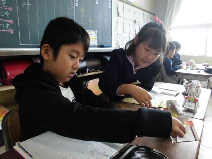 2組では、重さについて調べています。えんぴつや三角定規が1円玉何枚の重さと同じなのか、友達と協力して調べることができました。