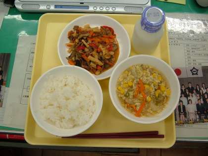 本日の給食です。献立は、ごはん、牛乳、かに玉スープ、チンジャオロースです。