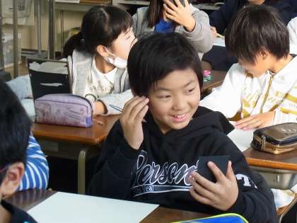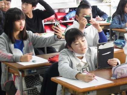 図工の時間、自画像を版画で仕上げるためにデッサンをしていました。