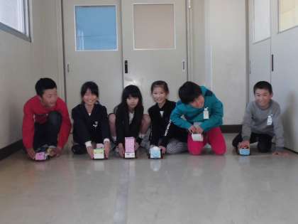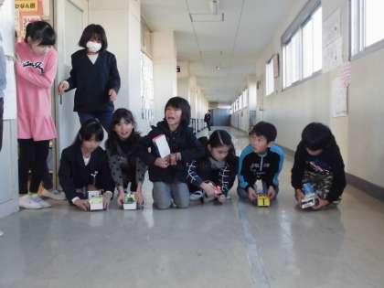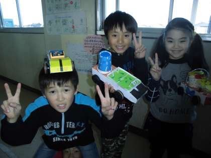 図工で作ったドリームカーで、レースを行いました。思い思いのデザインで作りあげた車。ゴムをまいて動かす仕組みなので長い距離は走りませんが、素敵な車がたくさんありました。