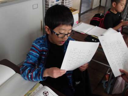算数の授業の最初には、計算力アップをはかるために、音声計算を行っています。今日は大きな数を行いました。どの児童も1つでも多く答えられるように、意欲的に取り組む姿が見られました。