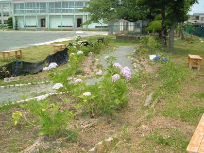 2月につくったあじさいロードに、たくさんのあじさいの花がつきました。このあたりは、以前はすごく草がはえるところでしたが、あじさいロードをみんなでよくしたいという思いで、子どもたちが草取りをして整備をしています。いろいろな種類のあじさいが植えられており、大きく育ったときが楽しみです。