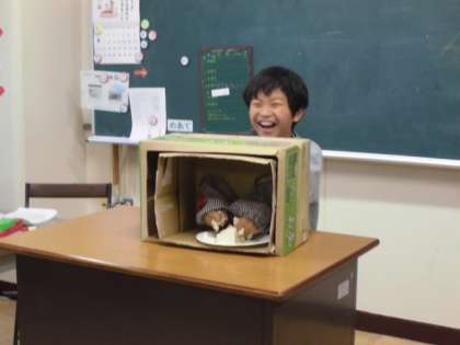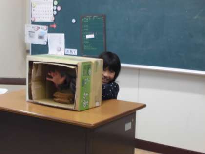 今日は2学期最後の日でした。2学期頑張ったご褒美で、お楽しみ会を開きました。箱の中身は何だろう?のゲームをしました。こんにゃくや豆腐、たわしやへびのおもちゃなど、触ってびっくり!みんな楽しんでいました。笑顔や笑い声がいっぱいでした☆