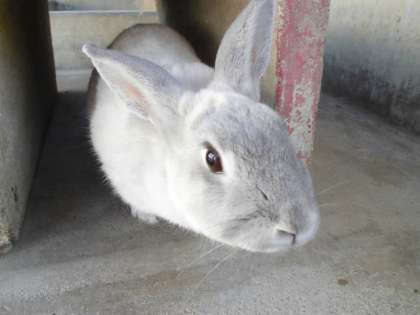 ウサギ小屋の中に入って近づくと、すっと顔を出してのぞいていました。