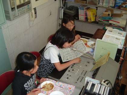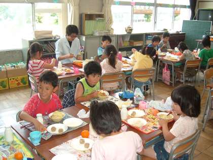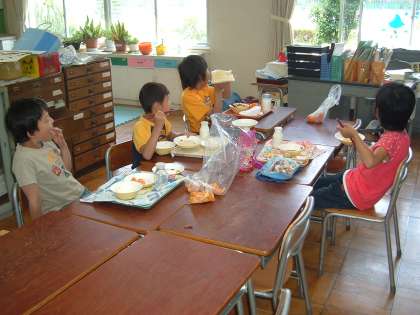 給食の時間に、今日から3日間、1年生の各クラスに栄養士の山田先生が子どもたちと会食します。そのときに、食育の指導も行っています。あすなろでは、みんなで協力して早く準備を済ませ、楽しく会食をしています。給食の時間が楽しくなるのも、放送委員が工夫を凝らして楽しく興味がわく内容の放送をしているからです。