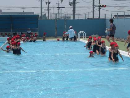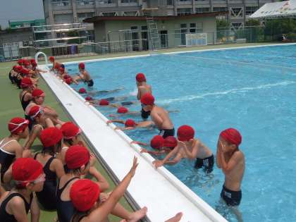 流れるプール、水なれ、顔つけ、バタ足などしっかり練習をした後でも、自由時間となったら元気いっぱいの1年生。水しぶきをいっぱい立てて遊びました。