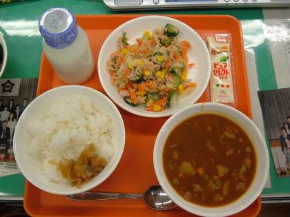 本日の給食です。献立はごはん、牛乳、チキンカレー、ツナサラダ(マヨネーズ)、福神漬けです。