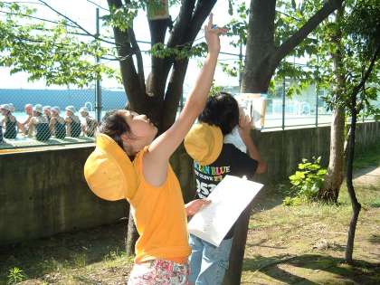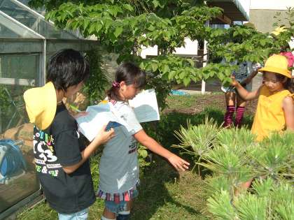 樹木あてコンクールが今日からあさってまでの3日間行われます。朝からあいにくの雨で、きょうは実施できるか心配でしたが、午後はよく晴れたので、予定通り行うことができました。みんなよく勉強しているので、はやく探すことができました。