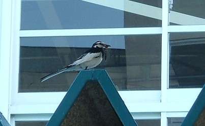 屋内運動場の渡り廊下の屋根裏にセキレイのつがいが巣をつくっています。あたりを注意しながら、巣の中にいるヒナにえさを与えようとしています。