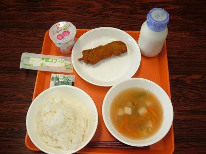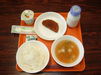 本日の給食です。今日はセレクト給食です。献立は、ごはん、牛乳、中華スープで、あとはセレクトのものです。写真の上がセレクト給食Aで、串カツ(ソース)、ももゼリーです。写真の下がセレクト給食Bで、ハムカツ(ソース)、パインゼリーです。さて、どちらが好みでしょうか?