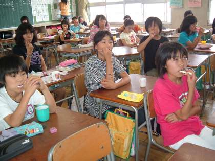 給食後は歯磨きタイムです。6年2組の歯磨きのようすを紹介します。