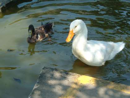 禽舎にいるアヒルやカモは、いつもはかごの中に閉じ込められていますが、掃除の時間は、禽舎内の掃除があるため、その時間は外の池でくつろげます。鳥たちが一番楽しそうな時間帯です。