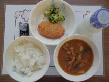 ごはん、牛乳、豚汁、えびカツ、ブロッコリーのおかか和え
