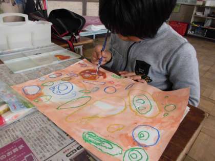 パスや水彩絵の具、色鉛筆などを使って色遊びを楽しんでいます。