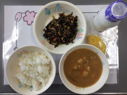 ごはん、牛乳、みそ汁、ひじきのいため煮、カットパイン