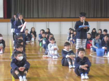 1年生が聞いたことがありそうな、テレビで流れるメロディーを、ユーモアも交えて発表しました。