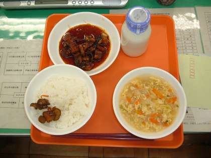 本日の給食です。献立は、ごはん、牛乳、かきたま汁、元気どんぶり(うなぎ)、きゅうりの漬物です。