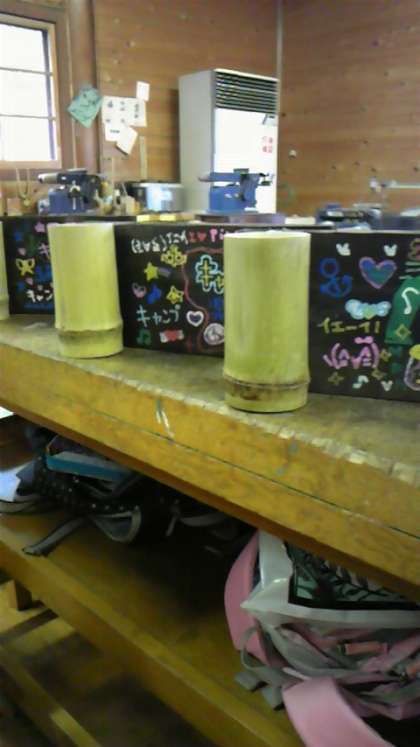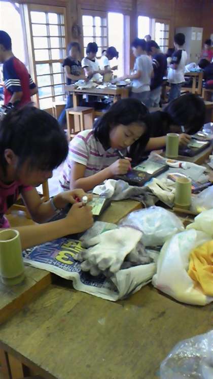 スギノキをガスバーナーで焼き、ポスターカラーなどで絵を描きました。『世界に一つだけの素敵なペン立て』ができました。
