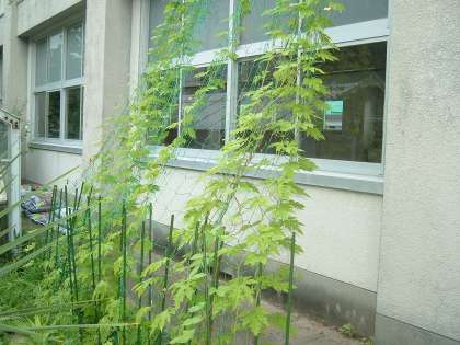 きょうは海の日です。運動場では、少年野球が活動をしています。中庭の温室横につくった緑のカーテンのゴーヤが大きく育ち始めました。今年は、北舎耐震工事のため、いつものところにつくることができず、条件が悪くて心配しましたが、順調に成長しています。